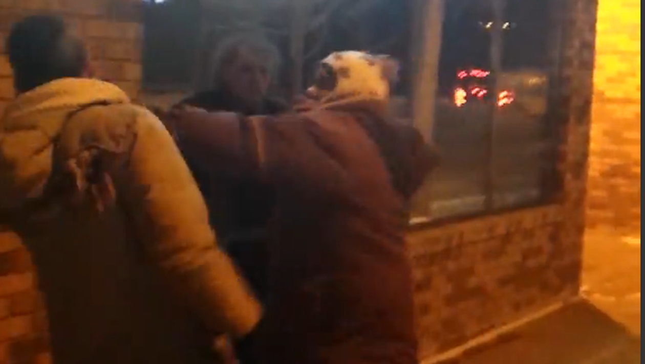 Femeia ii spune acestuia sa-si ceara iertare si sa se puna in genunchi, insa imediat incepe sa-l loveasca cu picioarele intr-o zona sensibila. Barbatul nu riposteaza, si incearca doar sa se fereasca in timp ce vrea sa-i explice ceva femeii. Dupa aproximativ doua minute, trecatorii aflati in zona intervin si ii despart pe cei doi, iar scandalul se termina.
