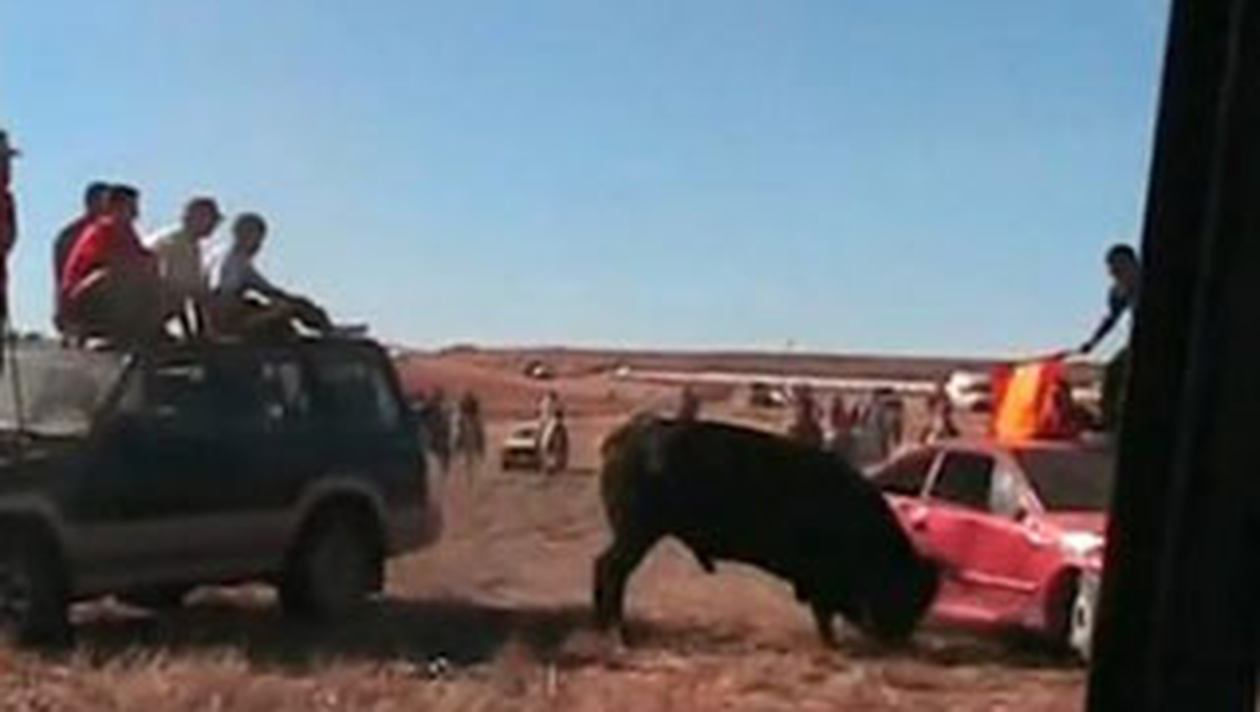 Taurul este provocat cu steaguri si se repede de mai multe ori spre masinile acestora, sub privirile amuzate ale celor prezenti. Imaginile, surprinse chiar de unul dintre participanti, au fost postate pe internet sub titlul: „Un nou sport in Spania – terorizand tauri cu ajutorul masinilor”. Ulterior, taurul este inconjurat de cativa calareti si atacat cu sulite.
