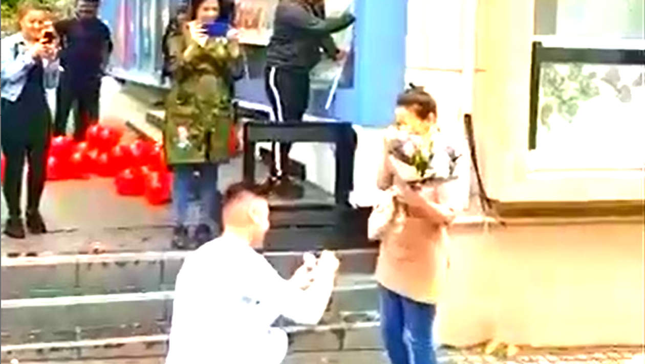 Fericitul eveniment s-a desfăşurat sub ochii a zeci de clienţi care aşteptau la coadă, care i-au filmat şi i-au aplaudat pe tinerii recent logodiți. Filmuleţul a devenit viral şi a strâns mii de aprecieri de la internauţi.