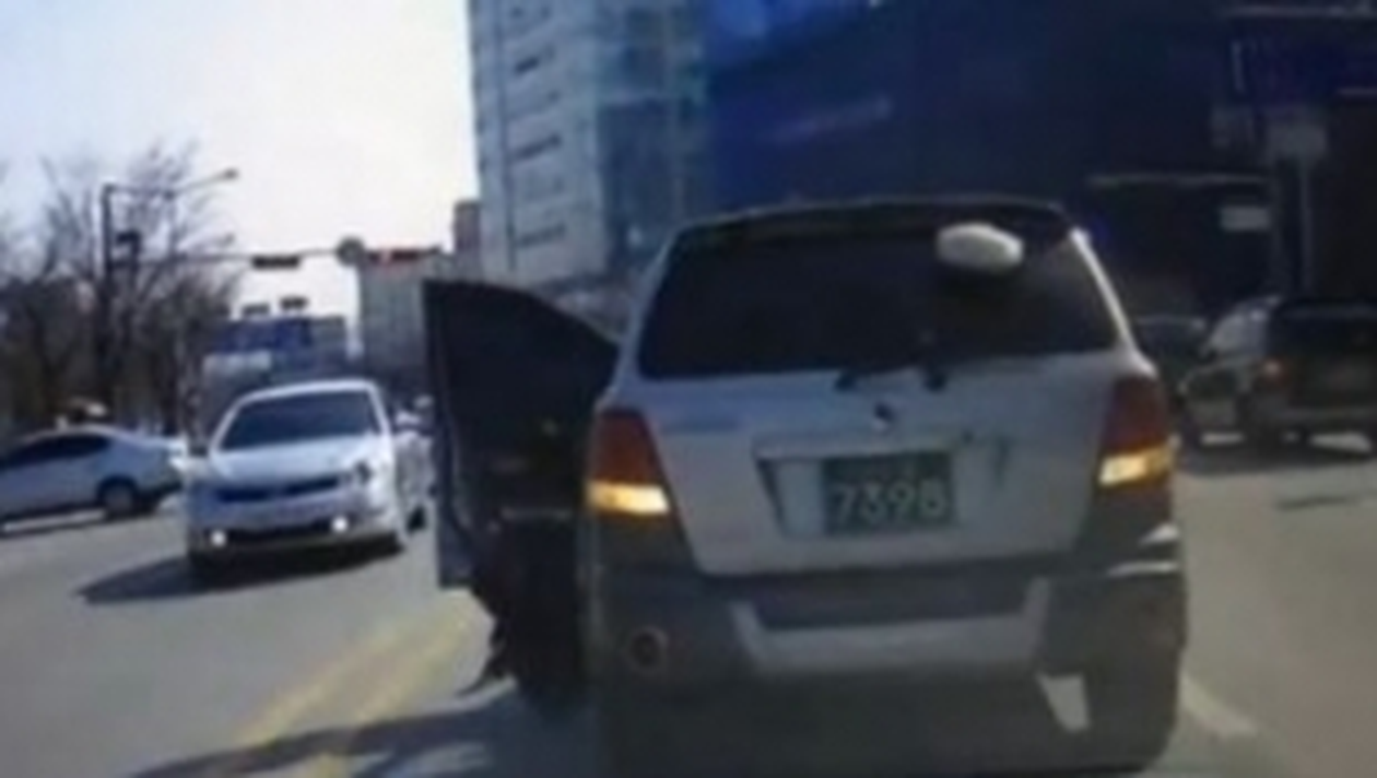 In timp ce incearcă să dea cu spatele, femeia tine portiera deschisă, pentru a se putea orienta mai bine şi a nu lovi ceva. Insă, ca prin minune, ca cade din autoturism, chair in mijlocul străzii. In acest timp, masina are incă cheile in contact şi continuă să meargă fără a provooca niciun accident.