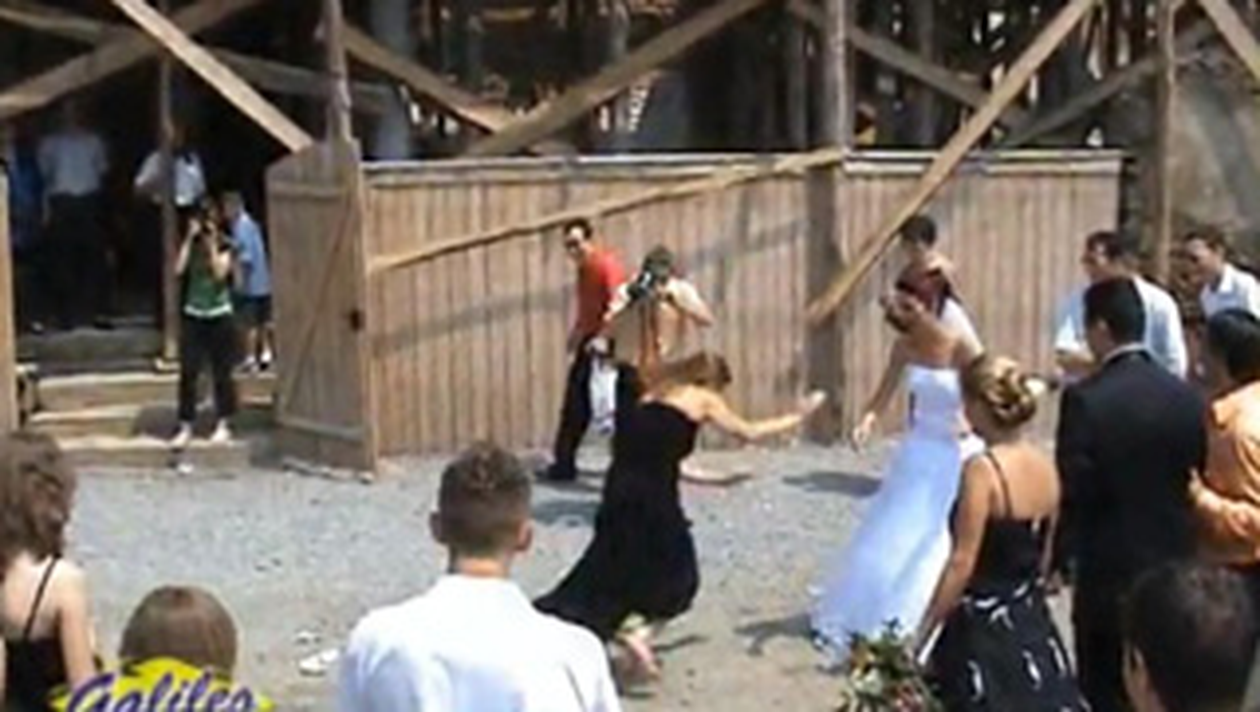 O tanara alearga sa prinda buchetul si din cauza vitezei prea mari, ajunge la picioarele miresei. Iar la momentul taierii tortului, acesta cade peste doi miri.