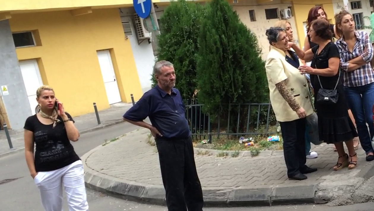Plictisit, omul urmareste evenimentul care are loc in apropierea camarutei sale din Pantelimon