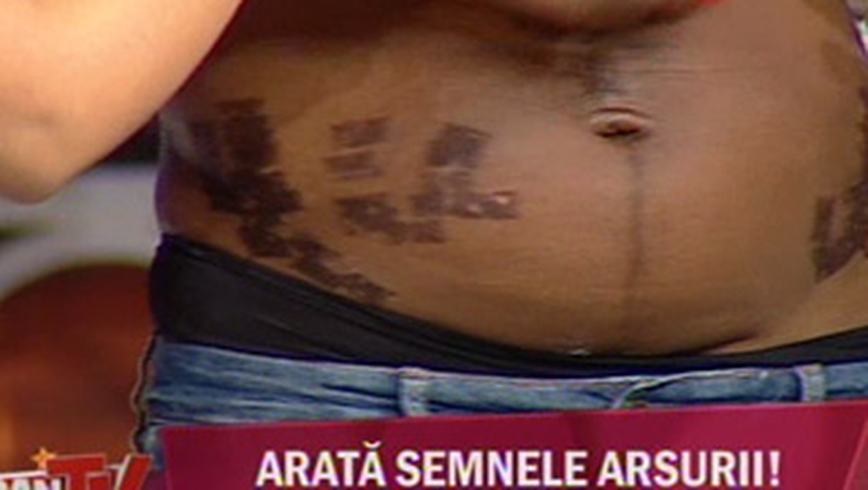 Pentru a convinge lumea ca arsurile suferite in urma sedintelor de infrumusetare, mulatra si-a aratat burta plina de rani, in direct la CANCAN TV de la Kanal D.