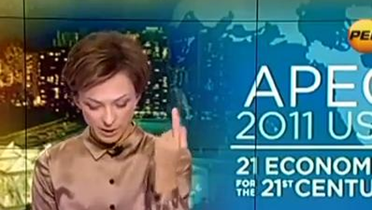 Tatiana Limanova prezinta o stire despre forumul APCE de la Hawaii. Ea vorbeste despre presedintia conferintei, care va fi asigurata de Dmitri Medvedev, apoi ridica mana si degetul mijlociu in timp ce anunta ca postul a fost ocupat anterior de Obama. Este posibil ca Limanova sa fi crezut ca nu este filmata in timp ce a facut acest gest.