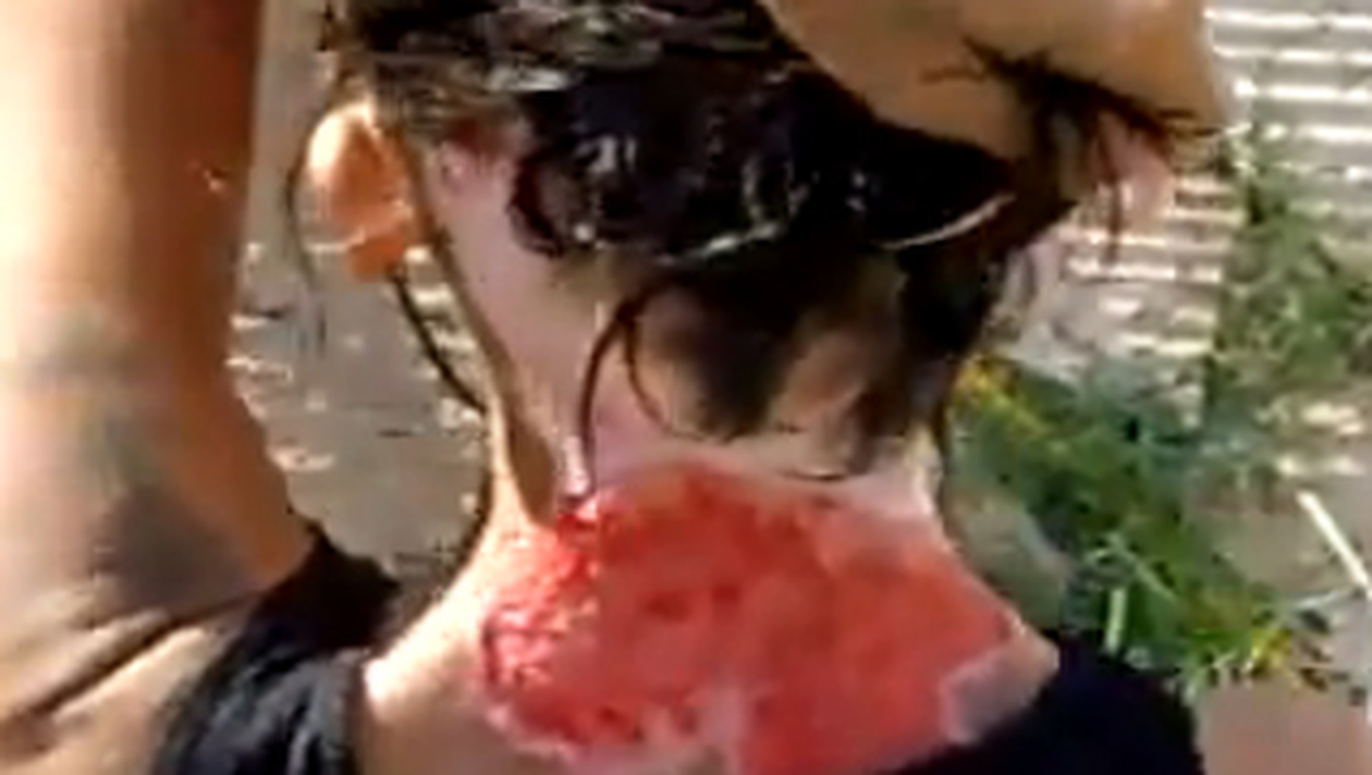 Femeia din imagini, in varsta de 40 de ani, este sub influenta drogurilor, nu este violenta, dar are miscari haotice provocate de substanta inhalata, dar si de durerea provocata de rana de la gat pe care si-a facut-o singura, desi spune ca a fost injunghiata.