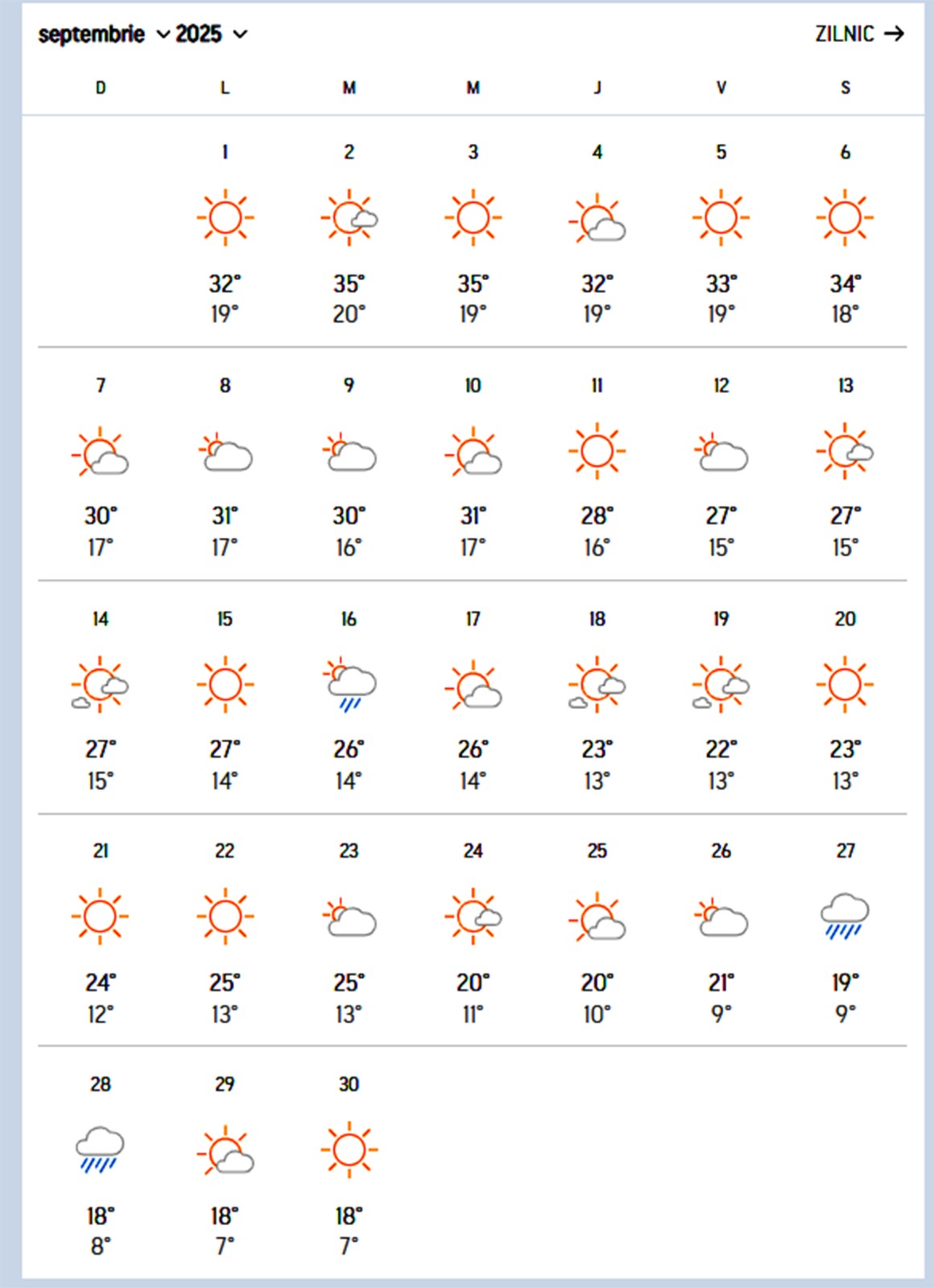 În perioada 20-30 septembrie, temperaturile maxime vor fi de 18-25 de grade Celsius, iar minimele se vor încadra între 7 și 13 grade Celsius. În zilele de 16, 27 și 28 septembrie sunt așteptate și precipitații.