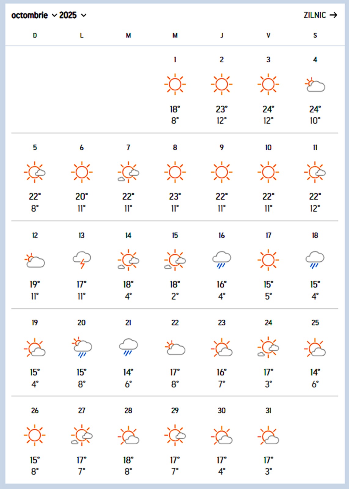 Octombrie 2025 începe cu câteva zile călduroase, cu temperaturi de 23 – 24 de grade Celsius. Începând cu 12 octombrie, vremea se va răci, valorile termice fiind cuprinse între 14 și 19 grade Celsius. În zilele de 16, 18, 20 și 21 octombrie sunt așteptate ploi.