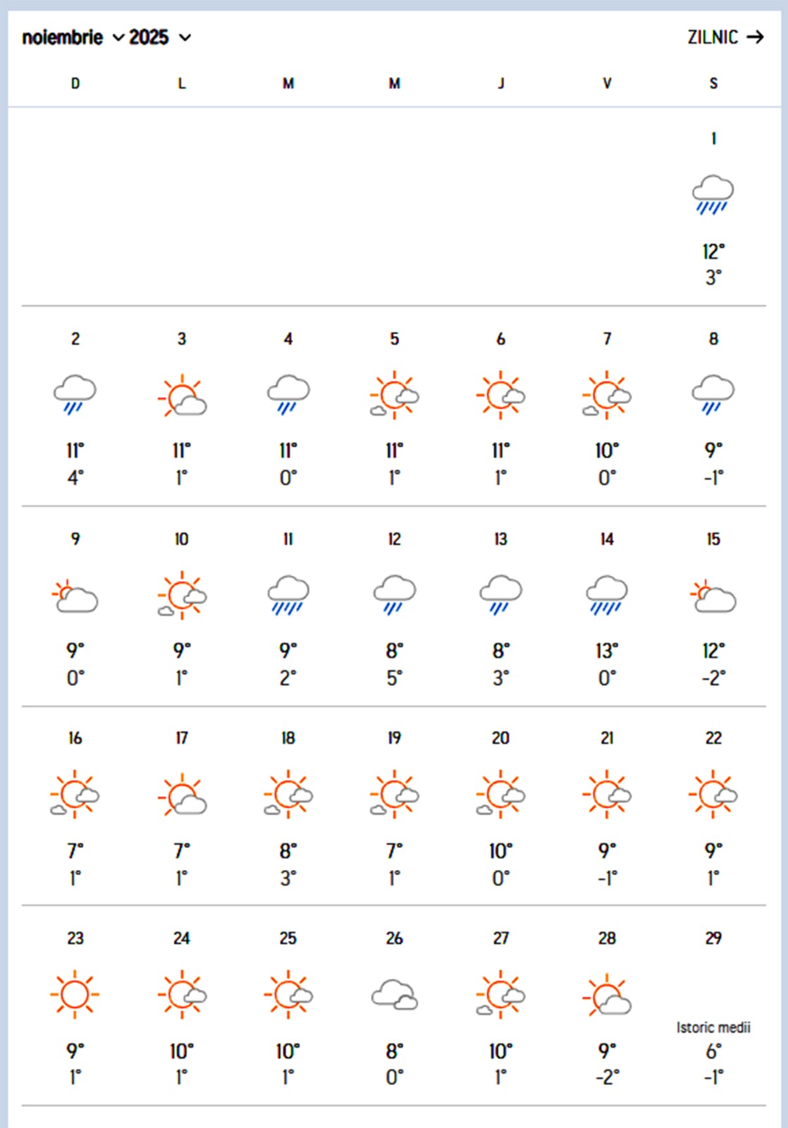 Noiembrie aduce precipitații în primele două săptămâni, cu maxime de 8-13 grade și minime de -2 – 5 grade Celsius. De la jumătatea lunii, ploile se vor opri, iar temperaturile vor fi de 7-12 grade pe timpul zilei și -2 – 3 grade noaptea.