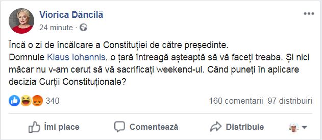 Domnule Klaus Iohannis, o țară întreagă așteaptă să vă faceți treaba. Și nici măcar nu v-am cerut să vă sacrificați weekend-ul. Când puneți în aplicare decizia Curții Constituționale?”, a scris Viorica Dăncilă pe pagina de socializare.