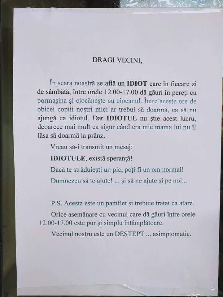 În scara noastră se află un IDIOT care în fiecare zi de sâmbătă, între orele 12.00 – 17.00 dă găuri în pereți cu bormașina și ciocănește cu ciocanul. Între aceste ore, de obicei, copiii noștri mici ar trebui să doarmă, ca să nu ajungă ca idiotul. Dar IDIOTUL nu știe acest lucru, deoarece mai mult ca sigur când era mic mama lui nu îl lăsa să doarmă la prânz.