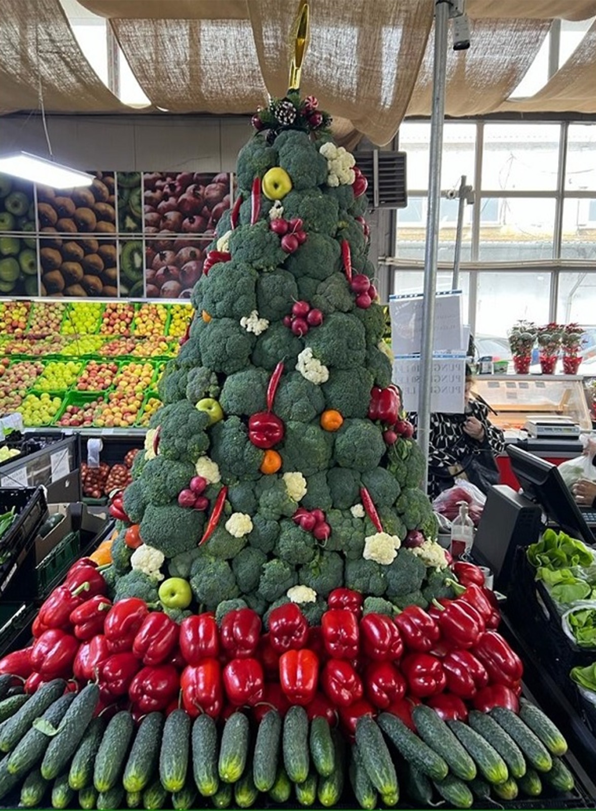 Un client a fost plăcut surprins în momentul în care a ajuns într-o piață din Ploiești. Unul dintre comercianți a pregătit cu iscusință un brad uriaș din legume. Impresionat de creația vânzătorului, bărbatul a făcut câteva imagini pe care le-a publicat în mediul online. În doar câteva ore s-au viralizat pe tot internetul!