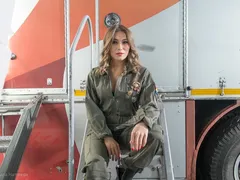 Monica, îmbrăcată într-o salopetă sexy, îl salută pe Virgil când pune piciorul pe scara „navei spaţiale”.
