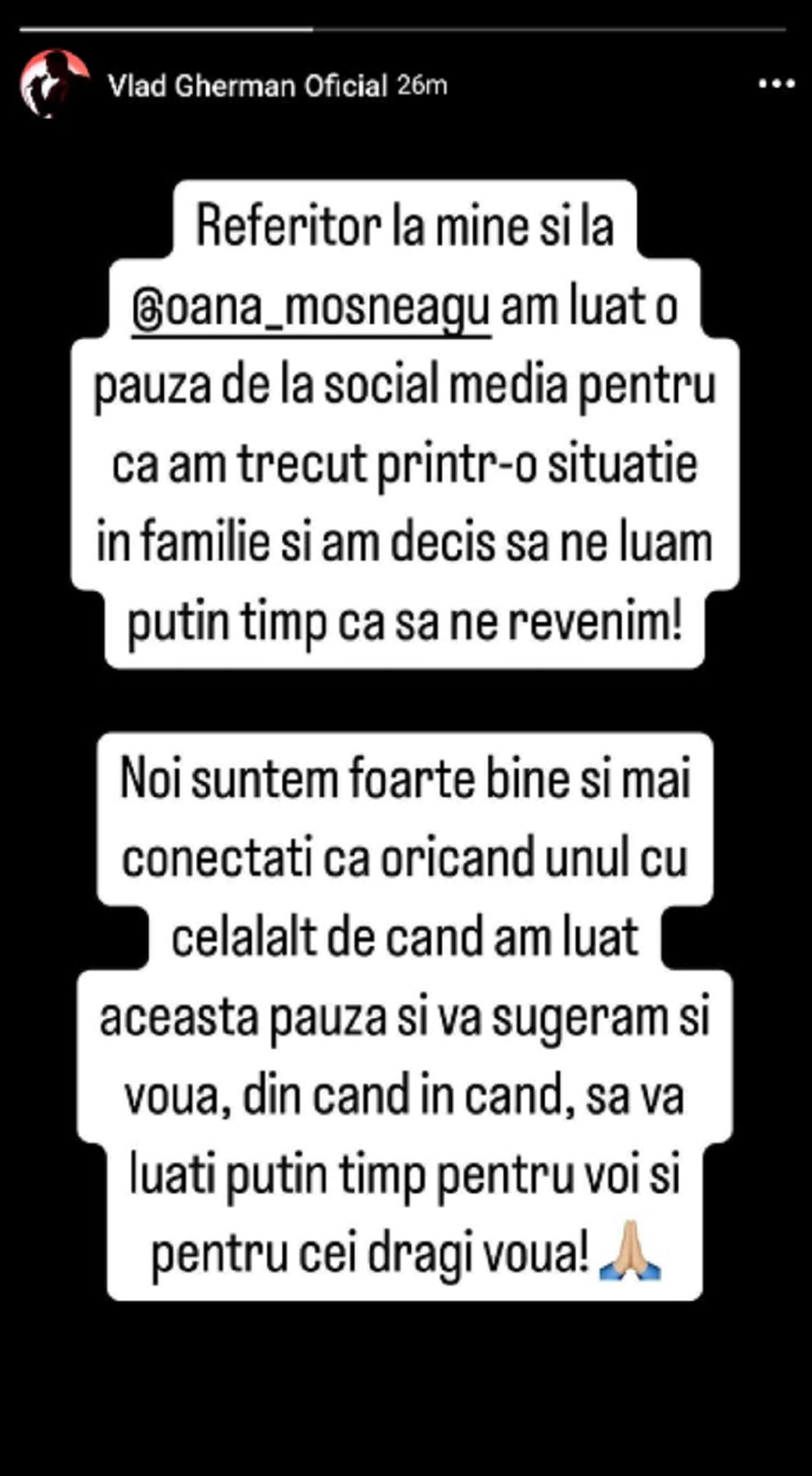 „Referitor la mine și la Oana Moșneagu, am luat o pauză de la social media pentru că am trecut printr-o situație în familie și am decis să ne luăm puțin timp ca să ne revenim. Noi suntem foarte bine și mai conectați ca oricând unul cu celălalt de când am luat această pauză. Vă sugerăm și vouă, din când în când, să vă luați timp pentru voi și pentru cei dragi vouă!”, a scris Vlad Gherman pe Facebook.
