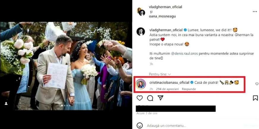 După oficializarea relației la Starea Cvilă, Vlad Gherman și-a împărtășit bucuria cu fanii săi de pe social-media. Actorul a publicat mai multe fotografii de la nuntă, iar printre mulțimea care a reacționat, Cristina Ciobănașu, fosta lui iubită, a transmis și ea un mesaj și le-a urat mirilor ”Casă de piatră”.