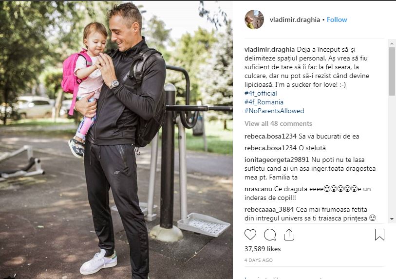 „Deja a început să-și delimiteze spațiul personal. Aș vrea să fiu suficient de tare să îi fac la fel seara, la culcare, dar nu pot să-i rezist când devine lipicioasă”, a scris Vladimir Drăghia, în dreptul fotografiei.