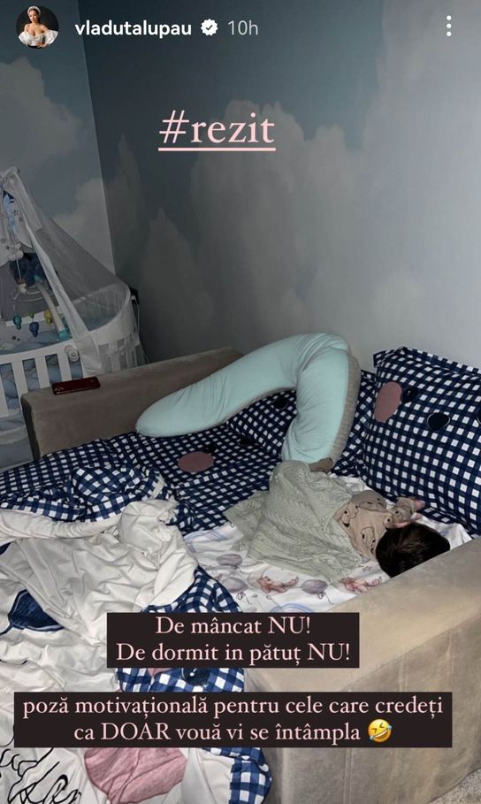 ”Rezist! De mâncat, nu! De dormit în pătuț, nu! Poză motivațională pentru cele care credeți că doar vouă vi se întâmplă”, a mai adăugat soția lui Adi Rus pe Instagram.