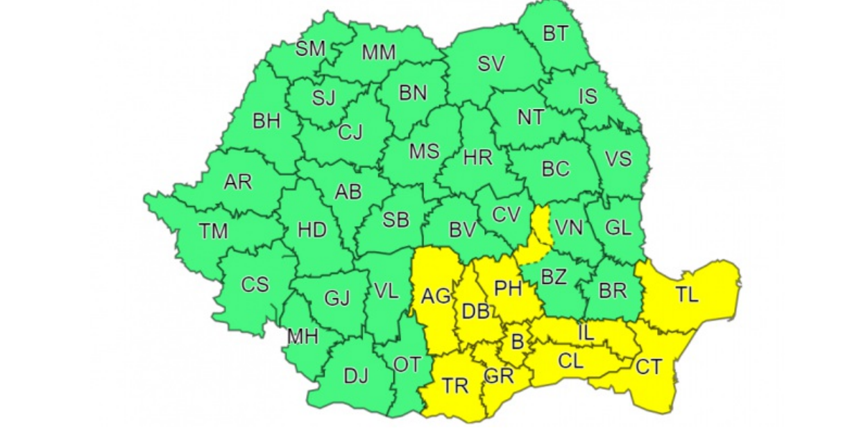 În intervalul 14 iunie, ora 12 – 15 iunie, ora 06 în Dobrogea, în cea mai mare parte a Munteniei și local în Carpații Meridionali și de