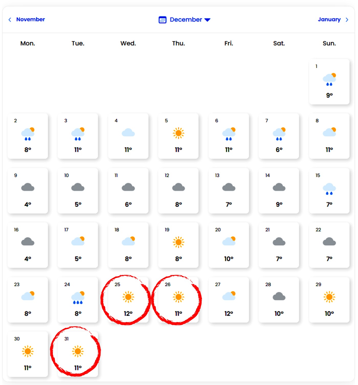 Meteorologilor EaseWeather au emis prognoza meteo pentru luna decembrie și anunță temperaturi mult peste normalul perioadei în preajma Sărbătorilor. De exemplu, de Crăciun, bucureștenii se vor bucura de o vreme frumoasă, fără ploi sau ninsori, iar termometrele vor indica 12 grade Celsius. De asemenea, și de Revelion, vremea rămâne una blândă, cu temperaturi de 11 grade Celsius.