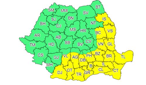 ANM a emis un Cod galben de ploi torențiale și vijelii în 19 județ, în timp ce în zonele sudice și estice se menține avertizarea meteo de caniculă.