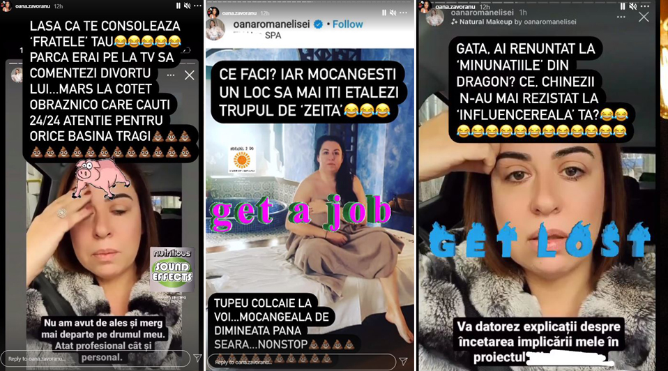 Oana Zăvoranu a criticat-o din nou pe fiica fostului prim-ministru pentru reclamele pe care le face la diferite produse pe care le face sau la saloanele în care se răsfață: “Ce faci? Iar mocăngești un loc să mai îți etalezi trupul de «zeiță»” – este doar unul dintre mesajele dure, în galeria foto a articolului găsiți și altele. Într-o altă postare, extravaganta vedetă a făcut o glumă nesărată în legătură cu hainele pe care le promova Oana Roman pentru magazinul online care îi aparține în acte soțului ei, Marius Elisei. “Gata, ai renunțat la «minunățiile» din Dragon? Ce, chinezii n-au mai rezistat la «influencereala» ta?”.